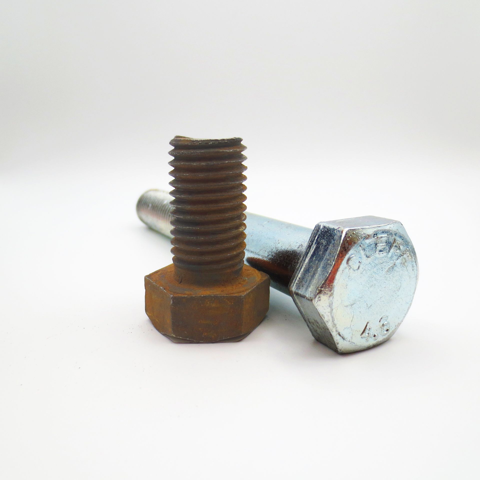 Eine Edelstahlschraube liegt auf einer weißen Fläche..
